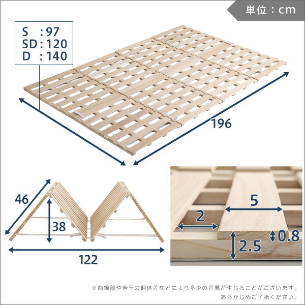 梱包サイズ:(約)48x22x62cm梱包重量:(約)6.7kg仕様詳細商品名桐すのこベッド 4つ折りタイプ(120cm・セミダブルサイズ)サイズシングル:(約)幅97x奥行196x高さ2.5cmセミダブル:(約)幅120x奥行196x高さ2.5cmダブル:(約)幅140x奥行196x高さ2.5cmカラーナチュラル特徴布団の下に一枚敷くだけで嫌な湿気を逃がします!使わない時はコンパクトに収納可能材質本体:桐材滑り止め:EVA樹脂静止耐荷重180kg梱包サイズシングル:(約)幅48x奥行12x高さ99cmセミダブル:(約)幅48x奥行22x高さ62cmダブル:(約)幅48x奥行22x高さ72cm注意※商品の仕様は、随時改良するように努めております。