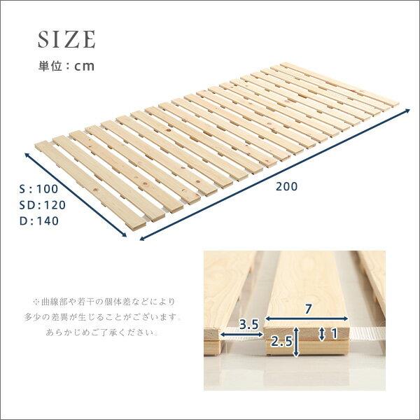 【商品について】すのこベッドロール式 檜仕様(シングル)【airrela-エアリラ-】■サイズ:■商品サイズ:(約)100x200x2.5CM■商品重量:(約)9.3KG■カラー:ナチュラル■素材:材質:天然木材 檜(ヒノキ)■その他:■梱包サイズ:(約)38x12x102CM■梱包重量:10KG仕様詳細商品名檜すのこベッド ロールタイプ(100cm・シングルサイズ)サイズシングル:(約)幅100x奥行200x高さ2.5cmセミダブル:(約)幅120x奥行200x高さ2.5cmダブル:(約)幅140x奥行200x高さ2.5cmカラーナチュラル特徴布団の下に一枚敷くだけで嫌な湿気を逃がします!使わない時はコンパクトに収納可能材質本体:檜材滑り止め:EVA樹脂静止耐荷重180kg梱包サイズシングル:(約)幅102x奥行38x高さ12cmセミダブル:(約)幅62x奥行38x高さ22cmダブル:(約)幅72x奥行38x高さ22cm注意※商品の仕様は、随時改良するように努めております。